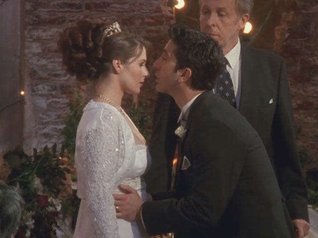 In contrast to his steady professional path was his volatile “love life”. The series began in 1994 when Ross was 27 years old and had just divorced his first wife of seven years, Carol, after Carol realized that she was a lesbian. The end of the marriage with his first love upset Ross to his core, especially as he highly values marriage, commitment, and heterosexual family structure. About a year after his divorce, Ross and Rachel began a relationship, which ended on its one-year anniversary after escalating fights, mistrust, and an affair stemming from a misunderstanding. After briefly getting back together with Rachel, Ross met his second wife, Emily. Unlike his first marriage, the second one was the result of a few weeks of passionate long-distance dating and Ross’ declaration of “It just feels right!”. Not surprisingly, it ended rather quickly — Ross made an unintended but fatal mistake at his wedding, leading to explosive mistrust, misunderstanding, and his second divorce.